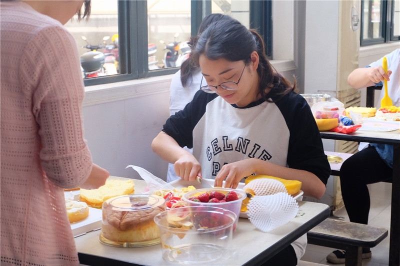 活動(dòng)開始前,工作人員細(xì)心地準(zhǔn)備好制作的材料:水果、工具、包裝等。懷著激動(dòng)的心情,大家早早地來到了現(xiàn)場(chǎng)分工合作,有人切水果、有人打奶油、有人分割蛋糕胚,忙得不亦樂乎。所有材料準(zhǔn)備齊全后,大家開始用心地整合自己的蛋糕,加點(diǎn)自己喜歡的水果,在蛋糕胚表面鋪上奶油。作為新手的大家,雖然有些手忙腳亂,但是利用水果與奶油的巧妙搭配,竟也顯得相得益彰。在制作的過程中大家紛紛結(jié)合了自己的想法、滿懷對(duì)母親的愛,完成了一個(gè)個(gè)充滿祝福的蛋糕。