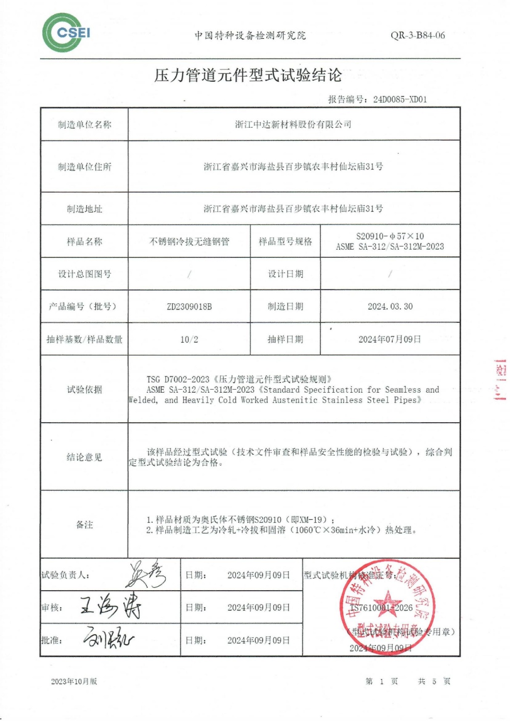 中達新材在不銹鋼冷軋(拔)無縫鋼管產品的質量管控與校驗,生產過程控制中等各方面,均符合產品的相關標準,在保證用戶實際需求的同時,確保產品質量穩定可靠,為用戶降低成本,提高可持續收益。此次成功獲取特種設備型式試驗證書是中達新材質量為本、規范發展之路上又一個重要里程碑。